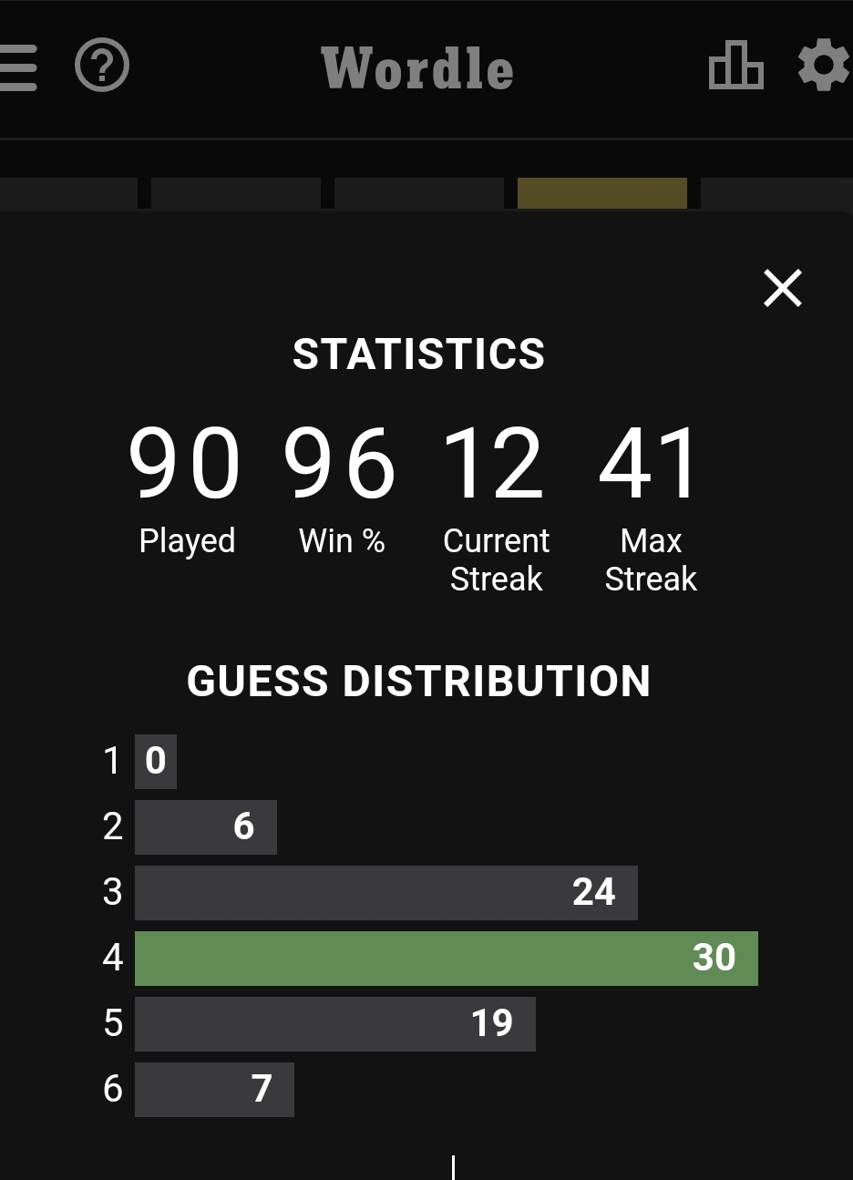 Wordle is for first thing in the morning.  I find that focusing on that mental task wakes me up.  As of this morning I have played it for 90 days straight (not first thing in the morning - that developed after I'd been playing a while).  I am yet to guess the word on the first attempt, and have made peace with that since I have a small collection of starting words which are highly unlikely to he the actual Wordle word of the day.  I'm working on a decent streak.  For the first 41 days I solved it.  Since then I have ended my streak three times in 90 days.  Once it completely stumped me, and the other two left me with a gamble as to which letters to play out of two options and I guessed wrong (such is my poor judgement).  My current streak being only 12 I have a lot of work to do to better the first one.